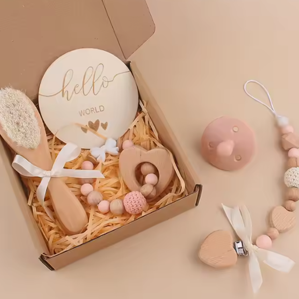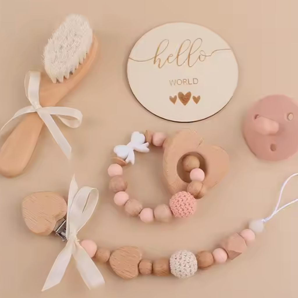 Az ajándékdobozban található kiegészítők, mint a hajkefe és a cumilánc, praktikusak, miközben a babának és a szülőknek is örömöt szereznek.
