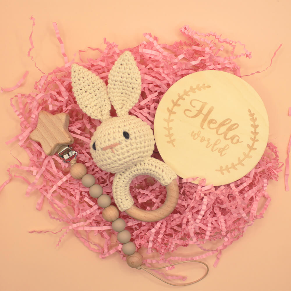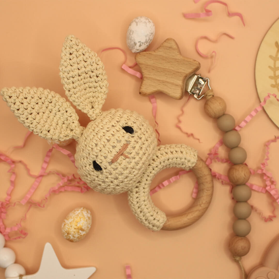🍼 Kézzel horgolt nyuszis csörgő játék – Puha pamutfonalból készült, bababarát fa karikával, amely könnyen megfogható a pici kezek számára. A kellemes csörgő hang segíti a baba érzékszervi fejlődését.