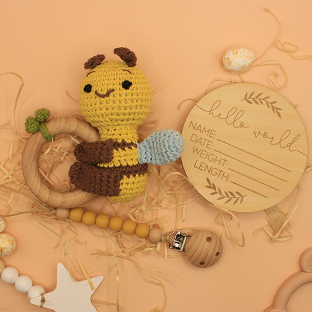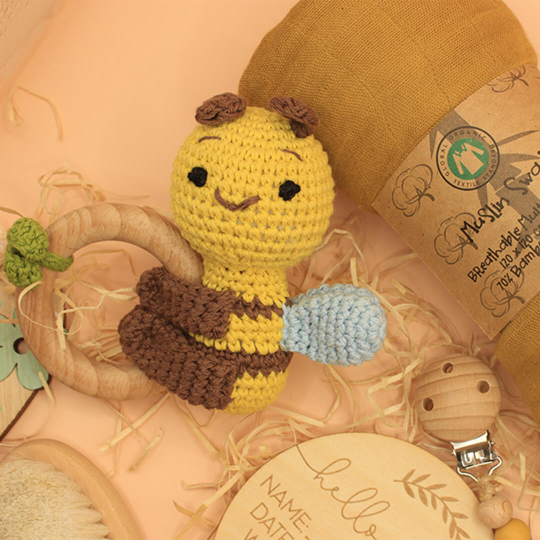 🍼 Kézzel horgolt méhecskés csörgő játék – Puha pamutfonalból készült, bababarát fa karikával, amely könnyen megfogható a pici kezek számára. A kellemes csörgő hang segíti a baba érzékszervi fejlődését.